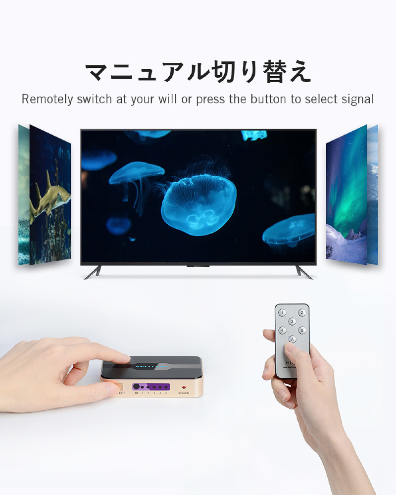 スイッチ操作・遠隔操作の切替自由 / リモコン付き:5つのHDMIソースをワイヤレスで離れていても切り替えることができるリモートコントローラー付きで、手動でも自動でも切替可能です。