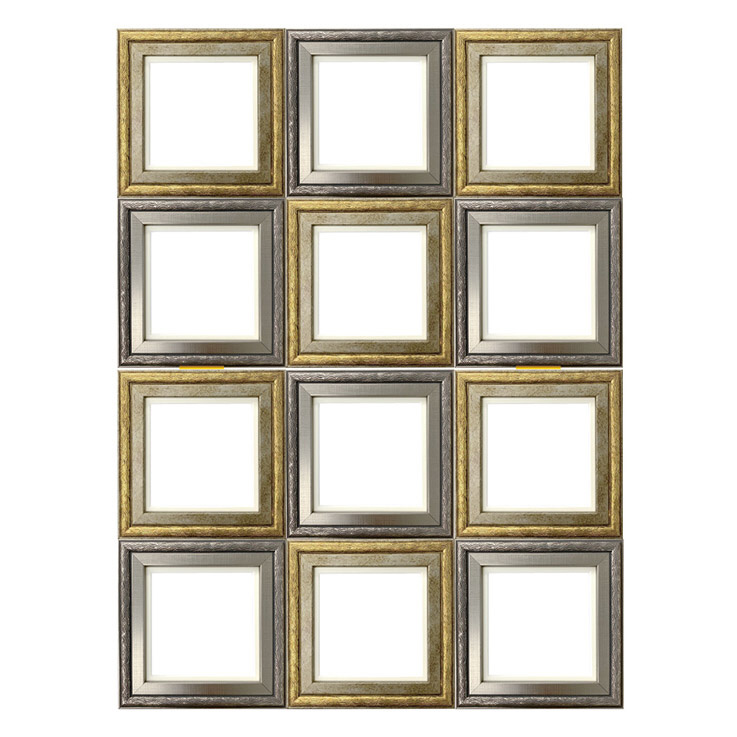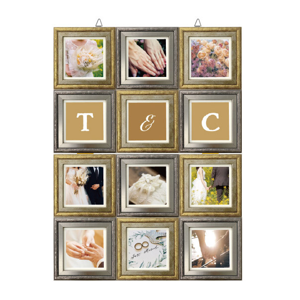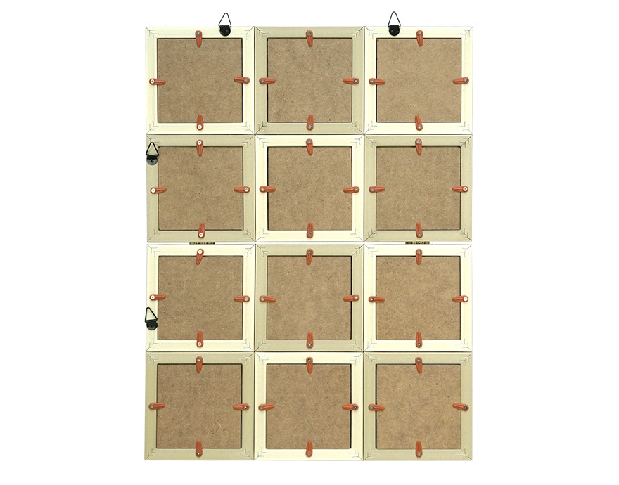 見開きで12枚の写真を飾れる折り畳み仕様のマルチフレーム。各フレームには89×89mm対応のマット入り、マットを外せば100×100mmまでの作品を収納できます。