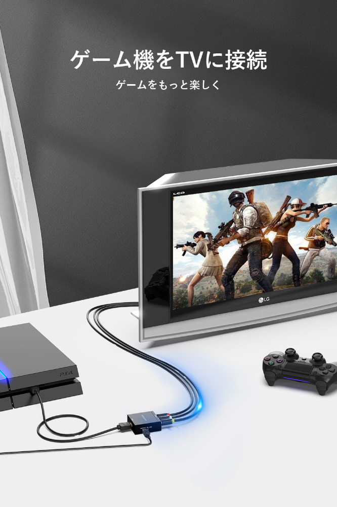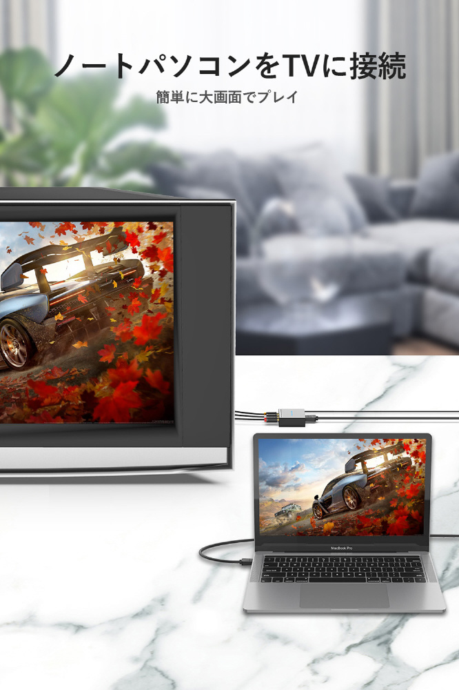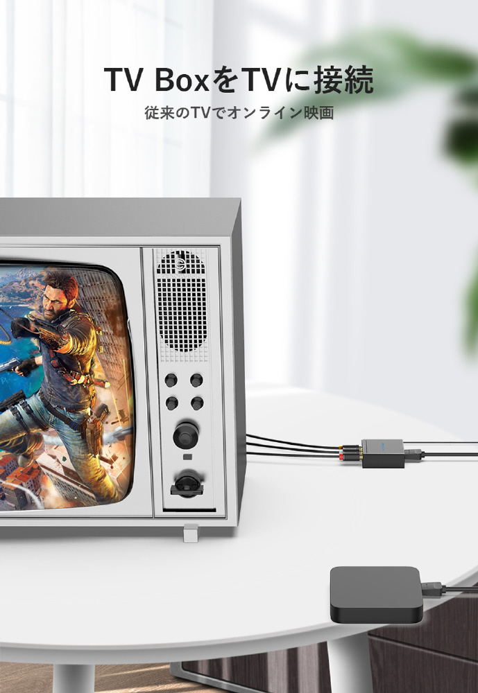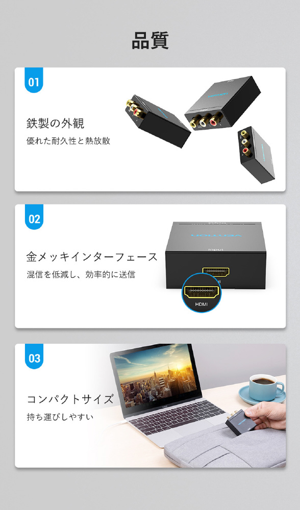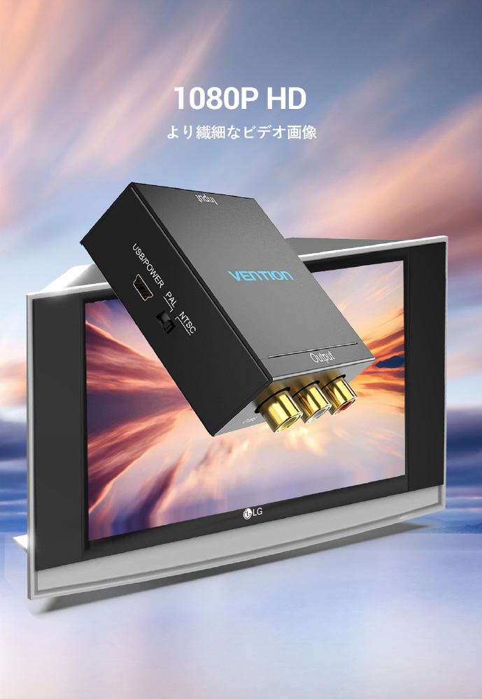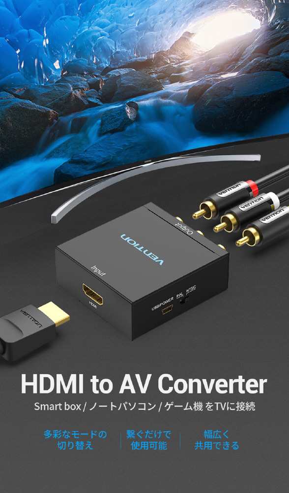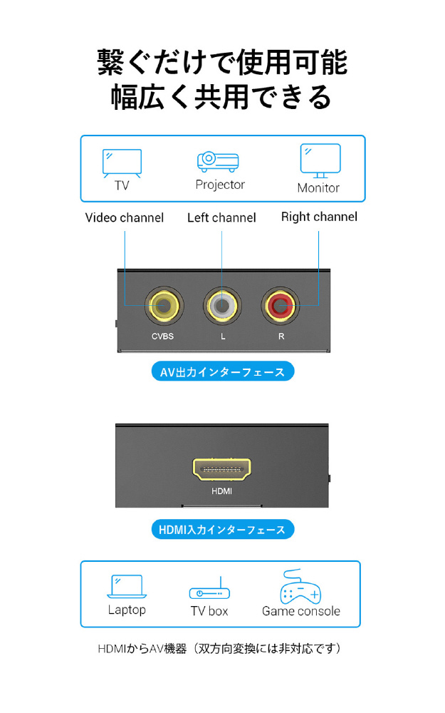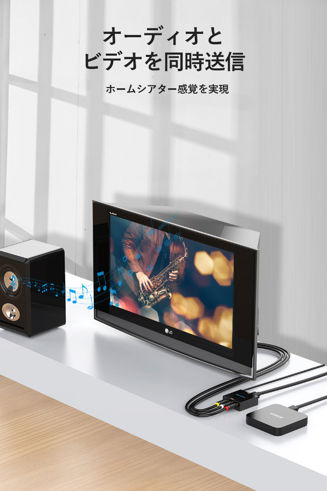映像出力がHDMIのみのパソコンやタブレットから、コンポジット(RCA)入力のテレビやプロジェクタに映像出力・音声転送することができるHDMI-RCA変換コンバーター。