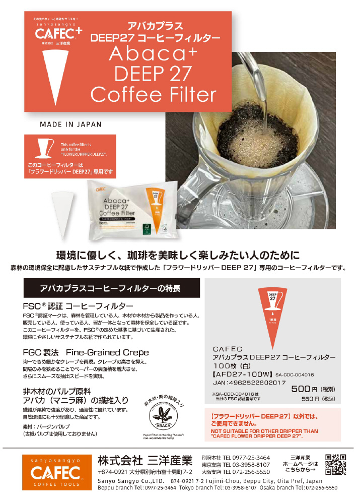 FSC?マーク森林認証コーヒーフィルター:FSC?認証マークは、森林を管理している人、木材や木材から製品を作っている人、販売している人、使っている人、皆が一体となって森林を保全している証です。このコーヒーフィルターをFSC?の定めた基準に基づいて生産された、環境にやさしいサスティナブルな紙で作られています。非木材のパルプ原料アバカ(マニラ麻)の繊維入り:繊維が柔軟で強度があり通液性に優れいています。自然環境に十分留意しております。FGC製法(Fine-GrainedCrepe):均一で細かなクレープを実現。クレープの高さを抑え、間隔のみを狭めることでペーパーの表面積を増大させ、さらにスムーズな抽出スピードを実現。環境に優しくコーヒーを美味しく楽しみたい人のために森林の環境保全に配慮したサスティナブルな紙を使用したアバカプラスフラワーDEEP27専用コーヒーフィルターです。