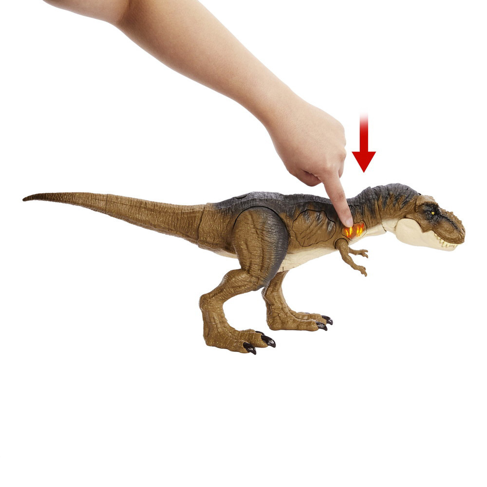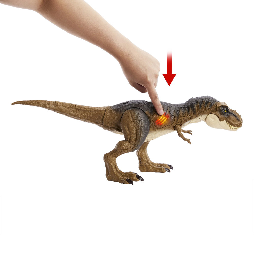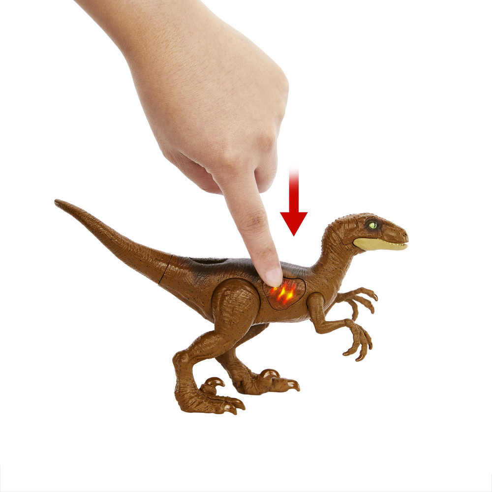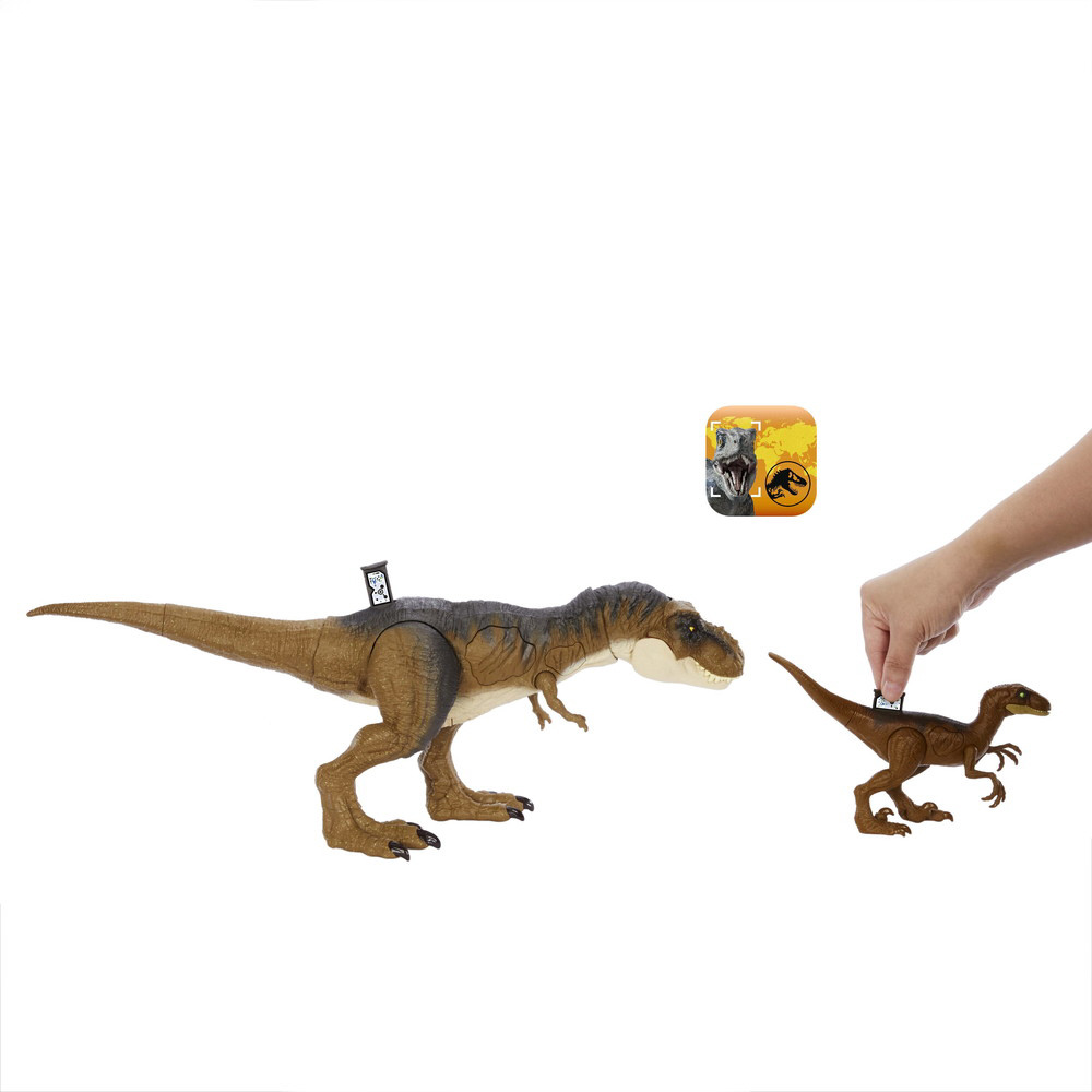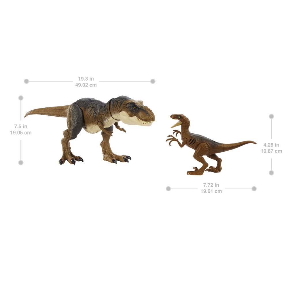 からだのボタンを押すとダメージが光ってほえるT-レックスとヴェロキラプトルの2体セット。