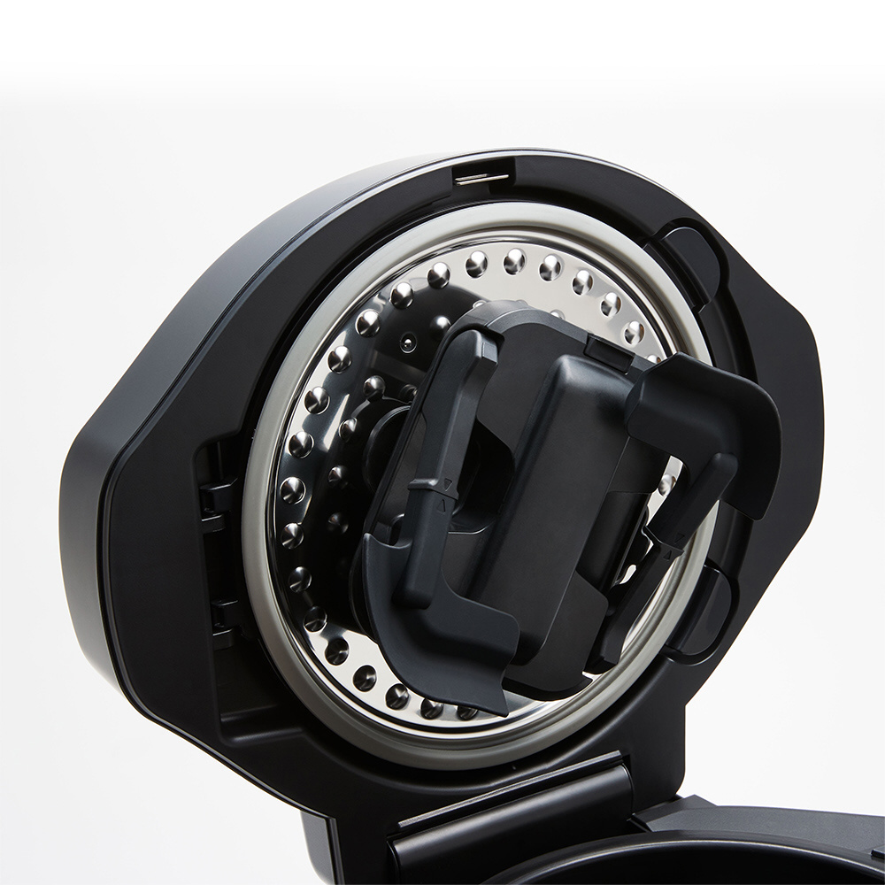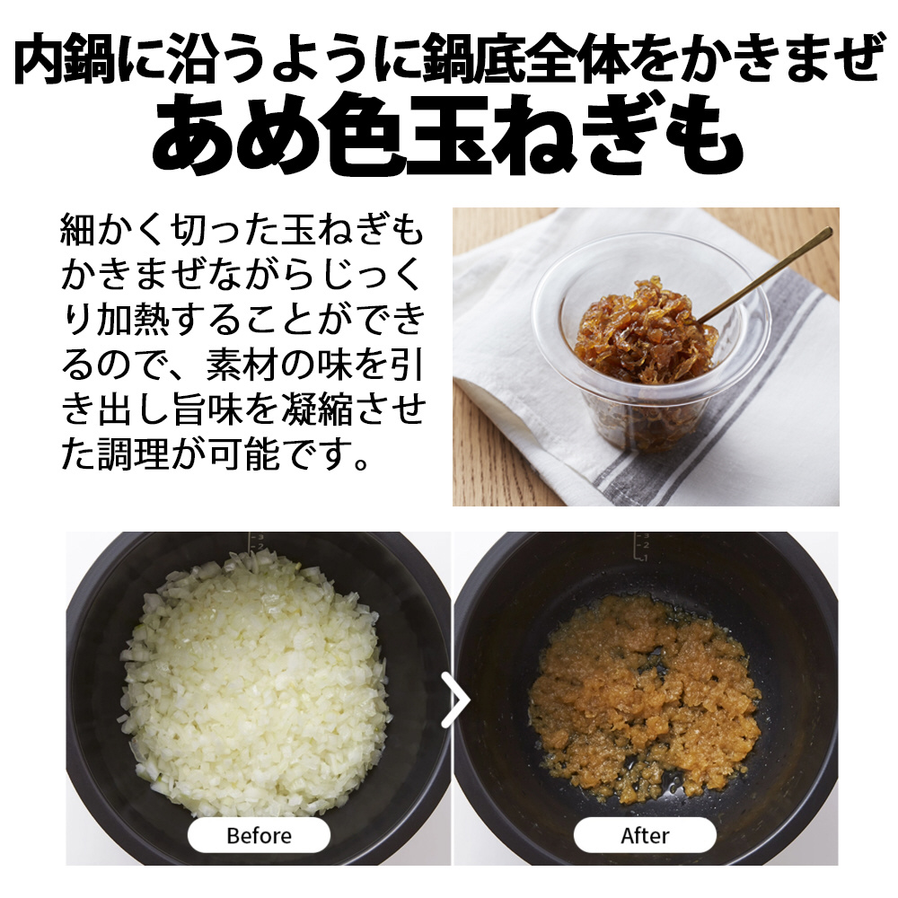 アーム部分の角度や先端の形状・素材を変更することで“ヘラでのかきまぜ”を再現し、内鍋に沿うように鍋底全体をかきまぜ。粒子の細かいスパイスやみじん切りの野菜などを活用した専門店ならではの味も手軽に楽しめます。
