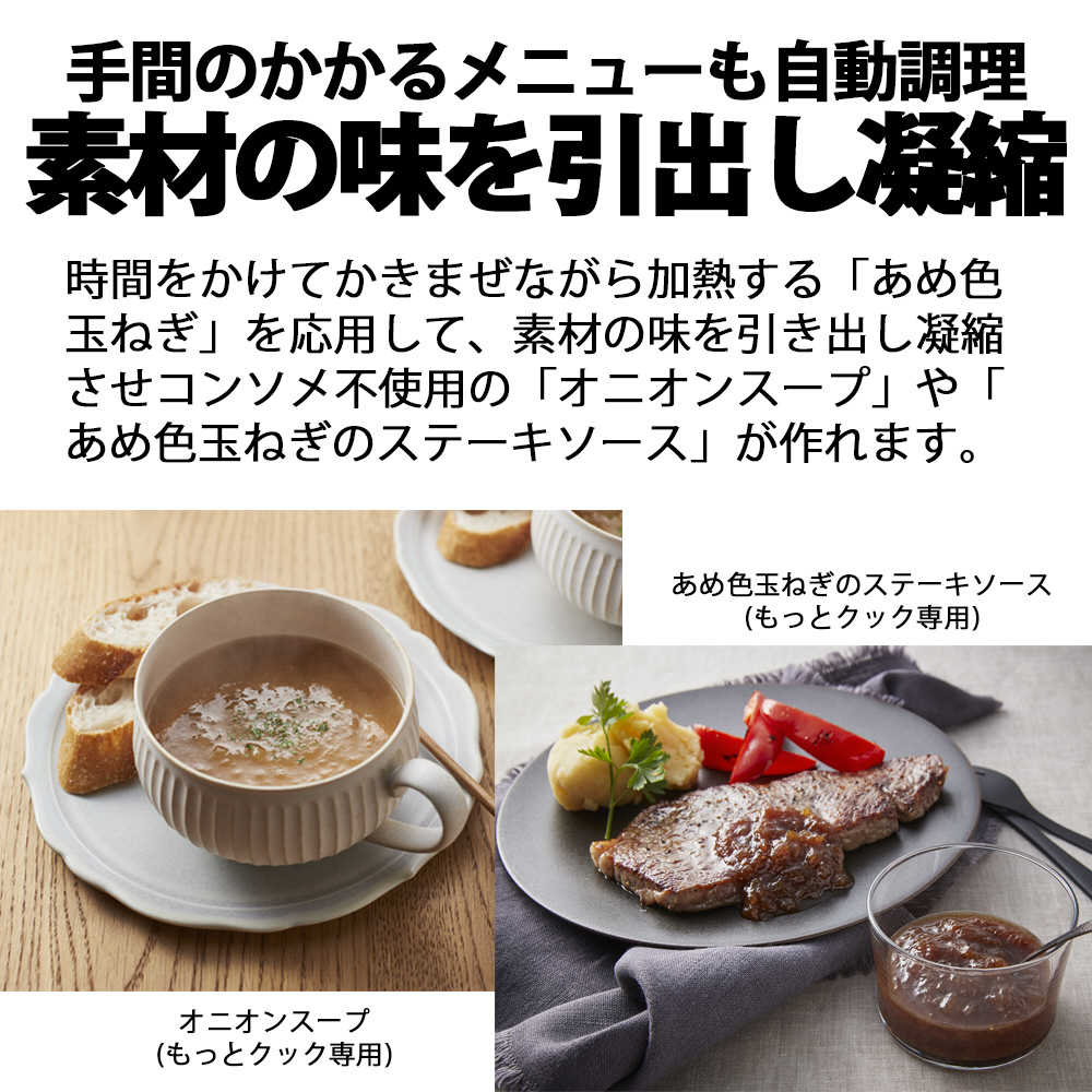 玉ねぎの素材の味を引き出し凝縮するため長時間の加熱が必要な、コンソメ不使用の「オニオンスープ」や、とろみのある素材を弱火で絶えずかきまぜる必要がある「ごま豆腐」、余り野菜で作ることができるふりかけ、高速回転で泡立てる「メレンゲ」などを調理でき、ホットクックの調理の幅を広げることができます。
