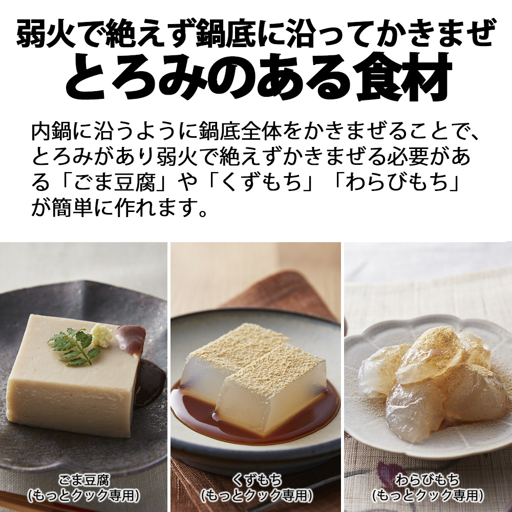 内鍋に沿うように鍋底全体をかきまぜることでとろみがあり絶えず弱火でかきまぜる必要がある「ごま豆腐」や「くずもち」「わらびもち」が簡単に作れます。
