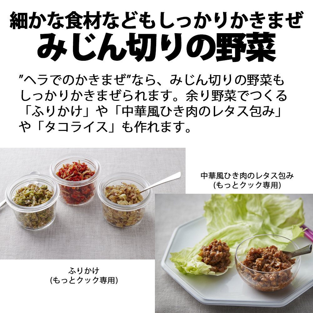 ”ヘラでのかきまぜ”なら、みじん切りの野菜もしっかりかきまぜられます。余り野菜でつくる「ふりかけ」や「中華風ひき肉のレタス包み」や「タコライス」も作れます。