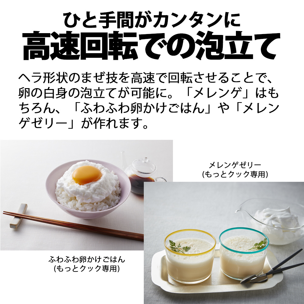 ヘラ形状のまぜ技を高速で回転させることで、卵の白身の泡立てが可能に。「メレンゲ」はもちろん、「ふわふわ卵かけごはん」や「メレンゲゼリー」が作れます。