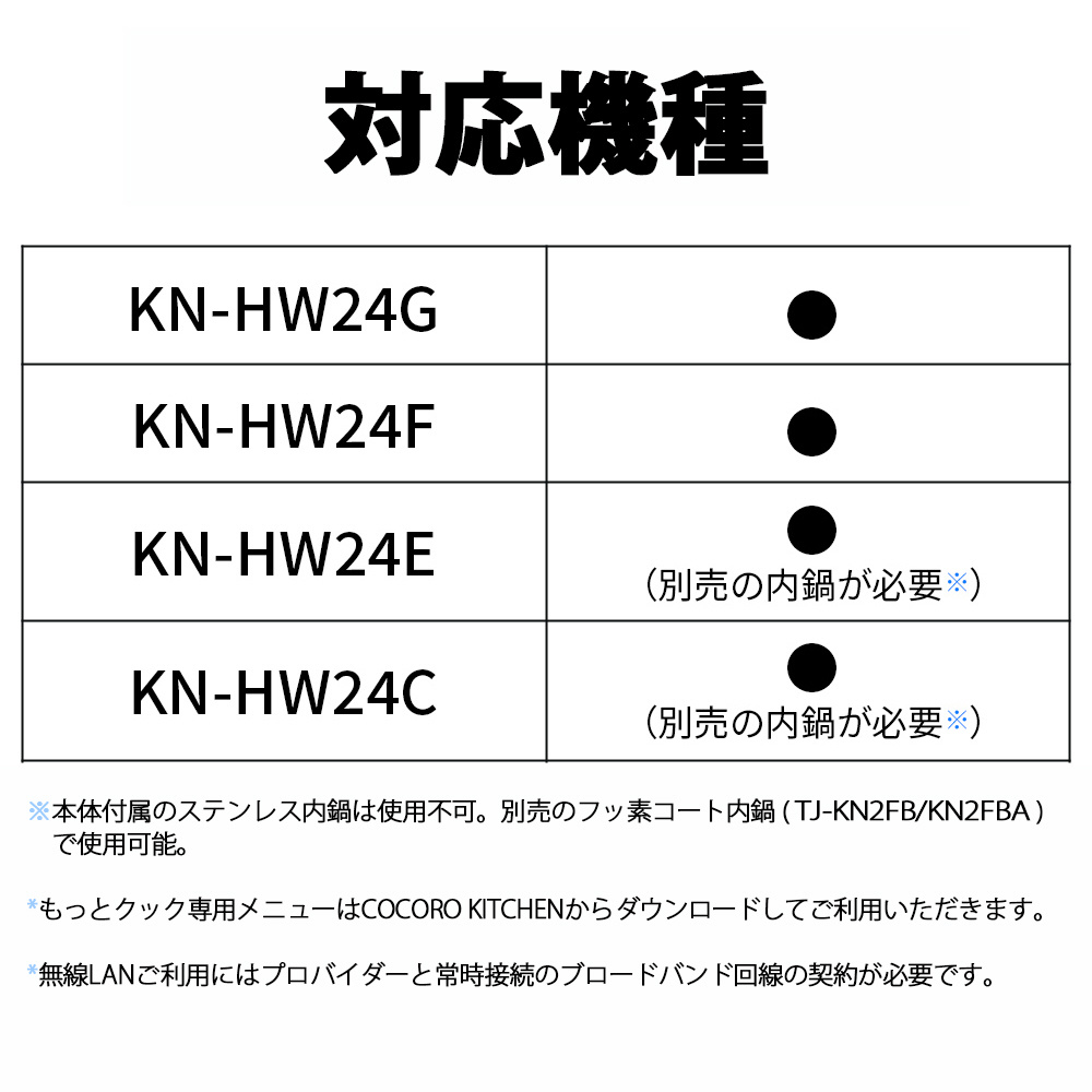 2.4Lタイプの無線LAN対応モデル専用です。フッ素コート鍋が付属していない機種(KN-HW24C/HW24E)で使用するには、別売のフッ素コート鍋のご購入が必要です。