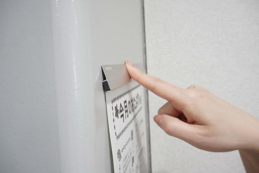 指一本で簡単掲示。学校のプリントや、地域のゴミ回収カレンダーなどに。毎月発行される行事のお知らせなど、頻繁に発行されるものに特に便利です。上部のくぼみを利用してポストカードを飾ることもできます。
