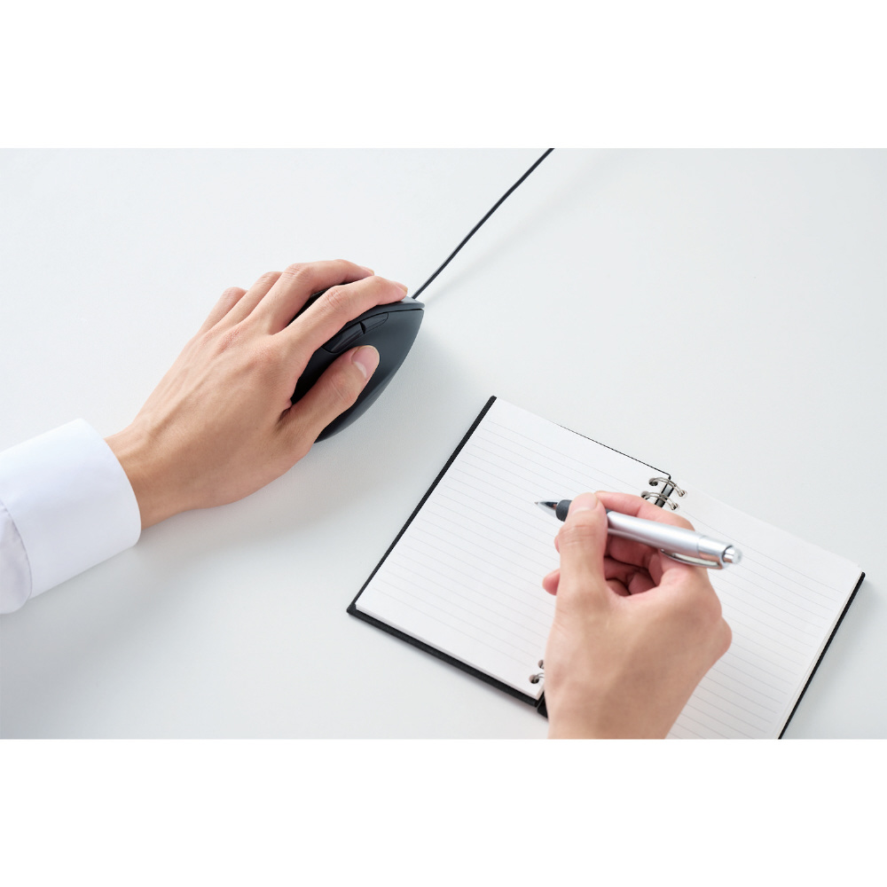 整形外科医との共同開発により自然な手の形のまま使える、握らないマウス“EX-G”シリーズの左手専用モデル。左利きの方はもちろん、右手でメモ書きや電話など別の作業をしたい方にもおすすめな有線5ボタンマウスです。