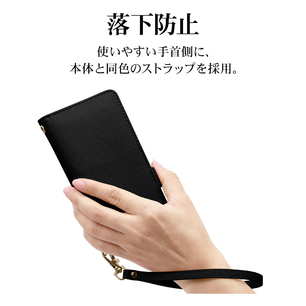手首まで通せるハンドストラップ付きの手帳ケースです。