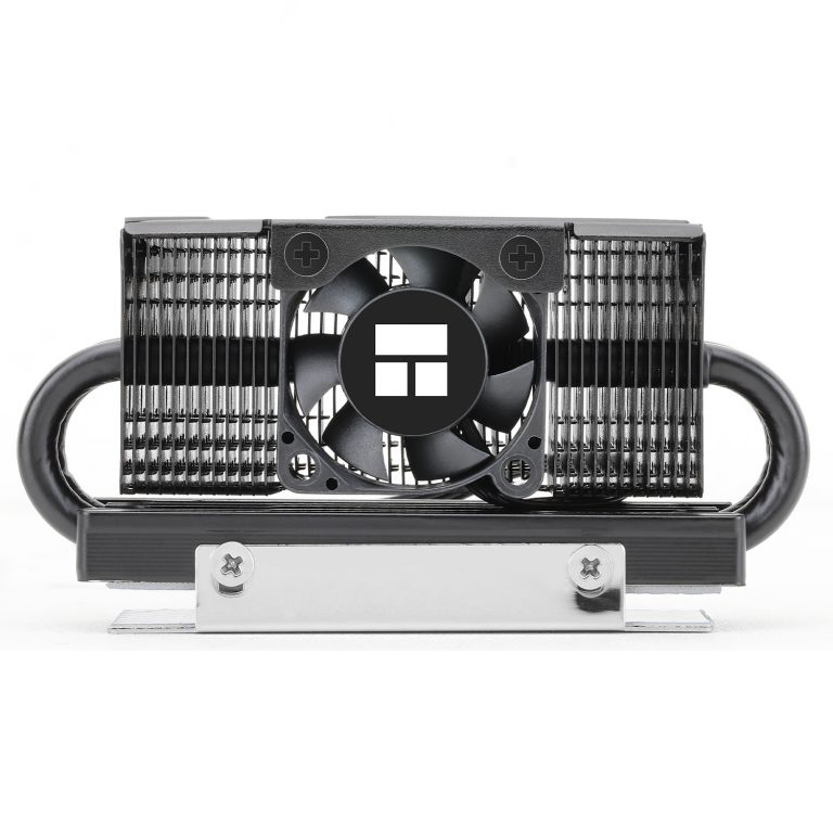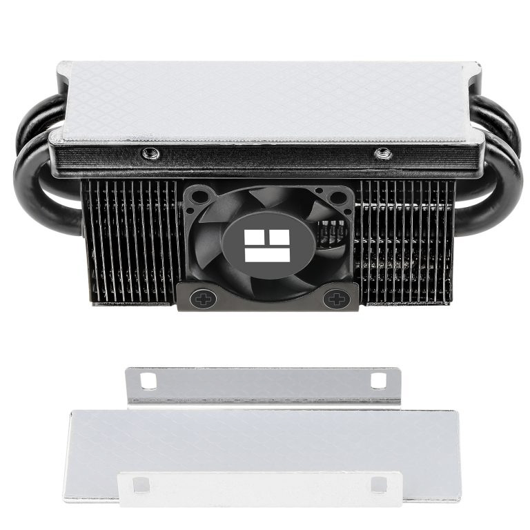 通常のプレート状のヒートシンクと違い、5mmヒートパイプを4本使用し、さらに大きなヒートシンクの中に冷却ファン搭載した、より強力にM.2 SSDを冷やしたい人向けのハイエンドなヒートシンクです。