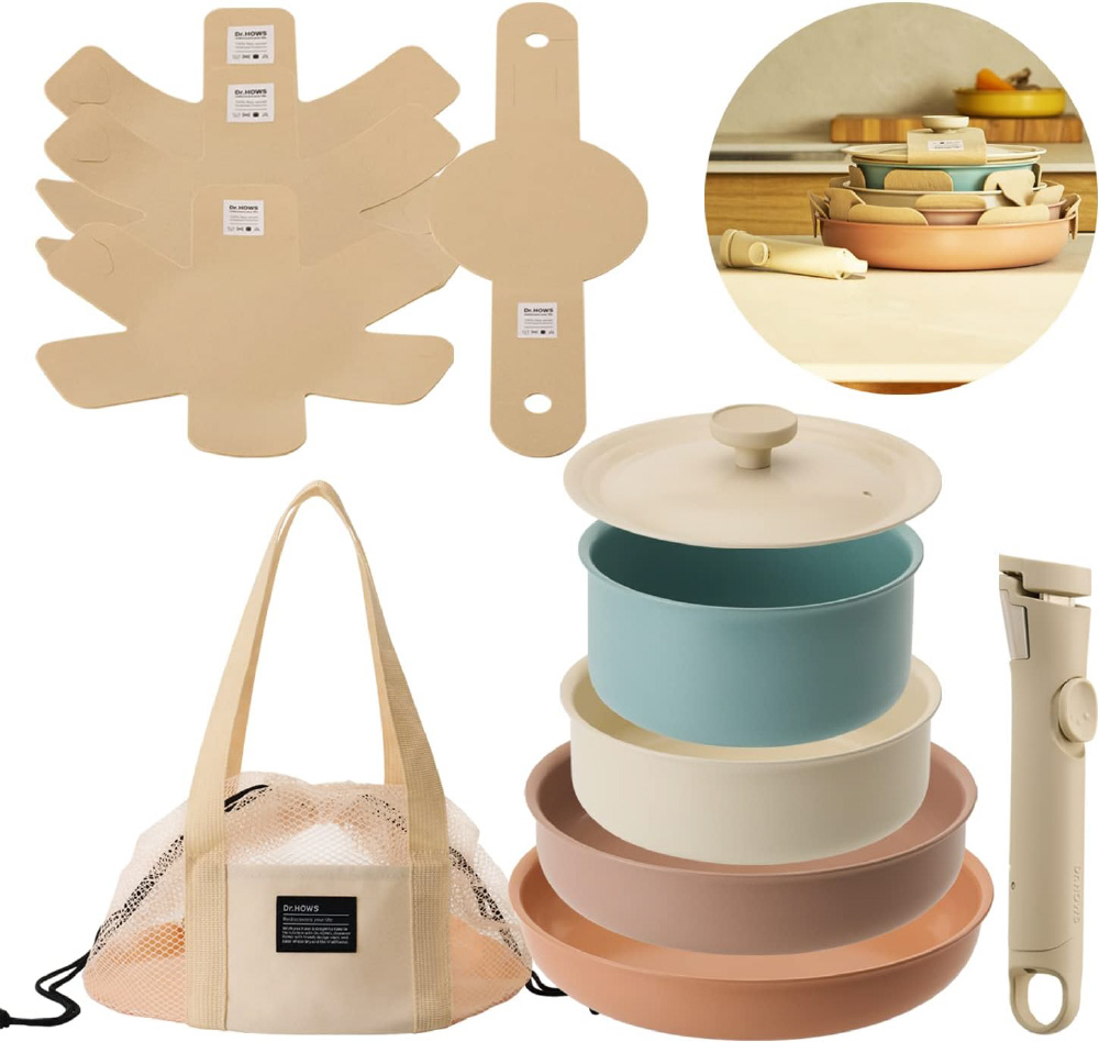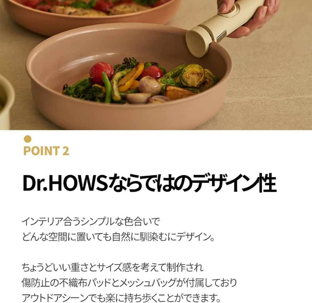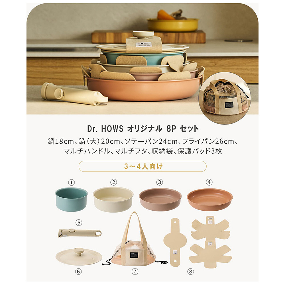 Dr. HOWS オリジナル 8P セット。鍋18cm、鍋(大)20cm、ソテーパン24cm、フライパン26cm、マルチハンドル、マルチフタ、収納袋、保護パッド4枚