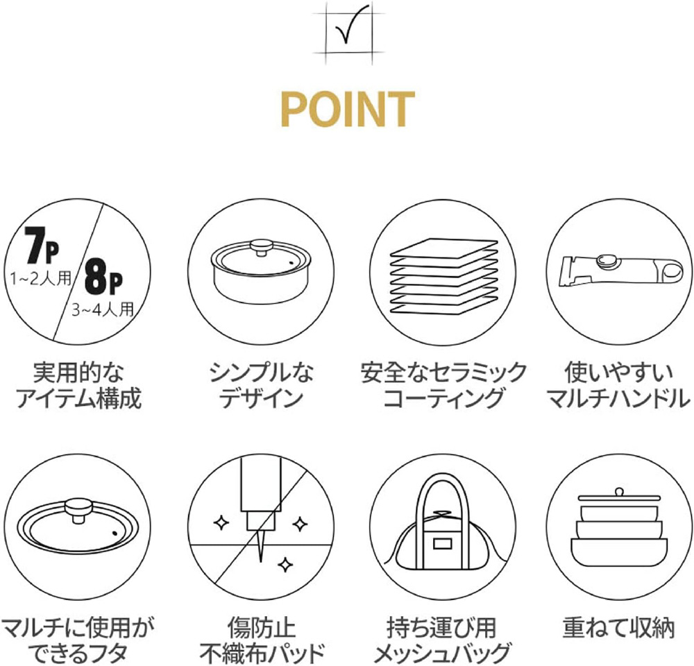 | 仕様1 | 本体:アルミニウム(セラミック コーティング) 蓋:アルミ、ベークライト、ステンレス、セラミック塗装 マルチハンドル:ベークライト、ステンレス、シリコン メッシュバッグ:ウェビング、メッシュ、PVC、ターポリン |