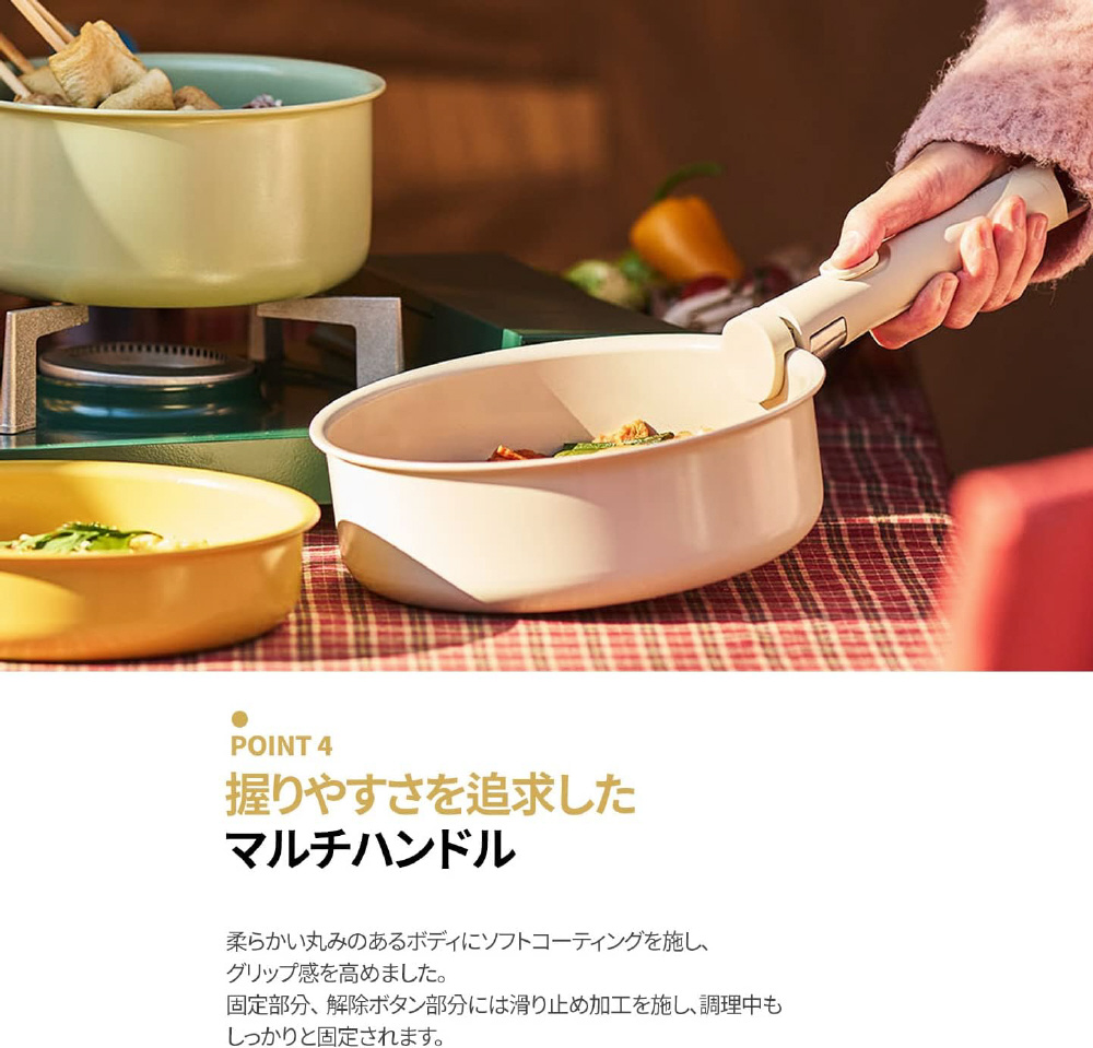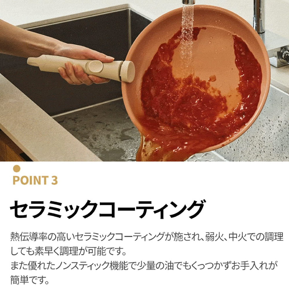 熱伝導薄が高いセラミックコーティングが施され、少ない油での調理が可能。