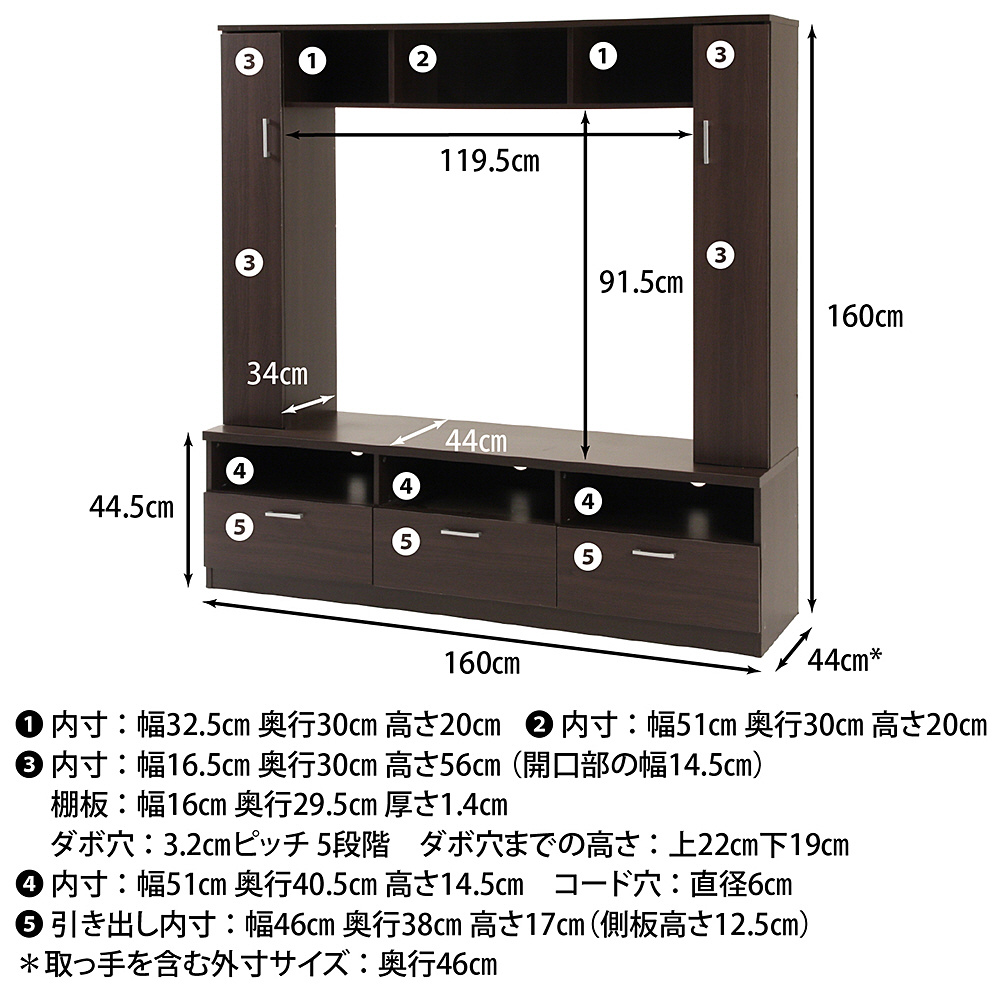| 仕様2 | ・その他サイズ: 耐荷重(天板)50kg、耐荷重(アーチ部上棚)10kg、適応TVサイズ42V型まで、引出内寸460x380x170mm |