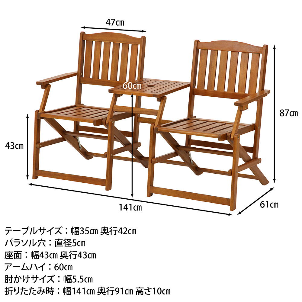 | 仕様2 | ・その他サイズ: 座面高430mm、耐荷重(座面片側)80kg、折りたたみサイズ1410x910x100mm、テーブルサイズ350x420mm、座面サイズ430x430mm、パラソル穴径50mm |