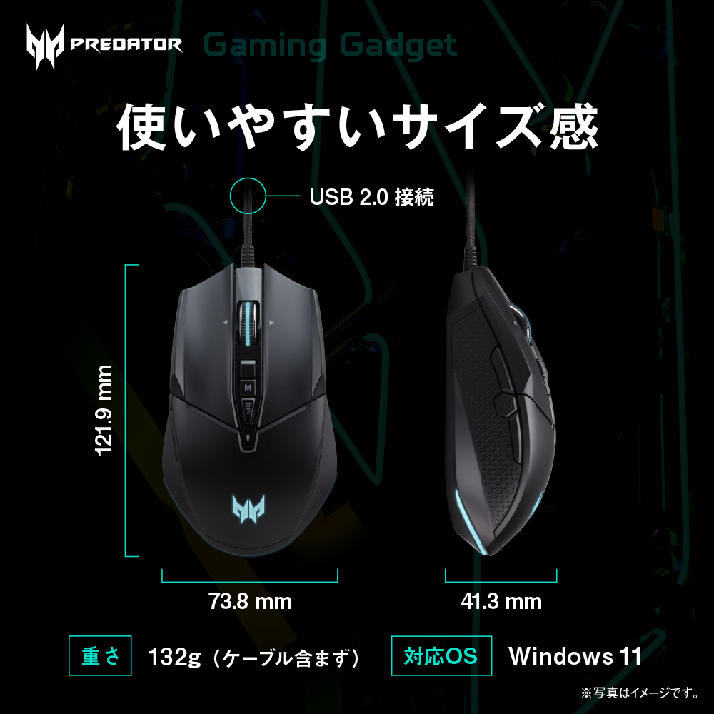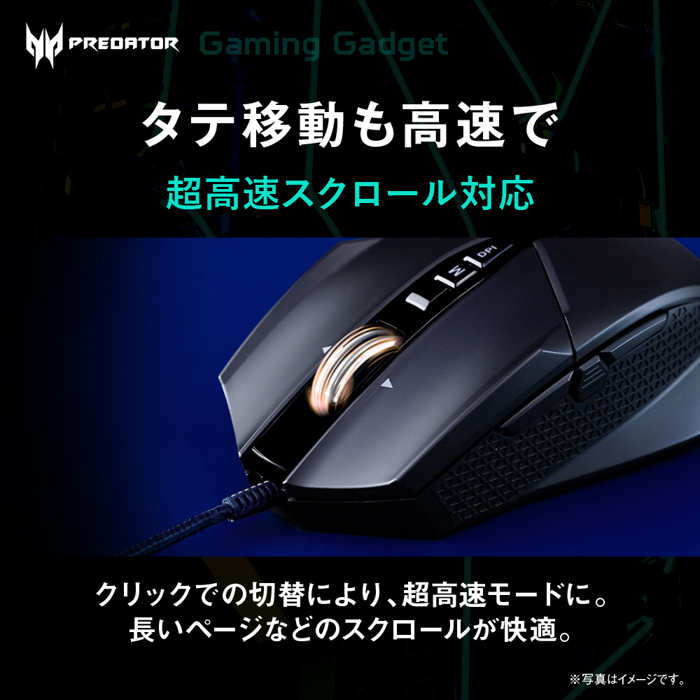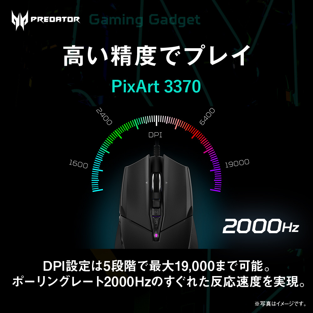 | 仕様2 | [接続性]USB 2.0 [消費電力]5V=100mA [材質]ABS樹脂 [トラッキング] センサータイプ:光学式 センサー:Pixart 3370 解像度:Min: 1600 - Max: 19000 ※Predator QuarterMasterで設定可能 DPI設定:5段階(1600/2400/3200/6400/19000) 最大速度:400 IPS 最大加速:約50G |