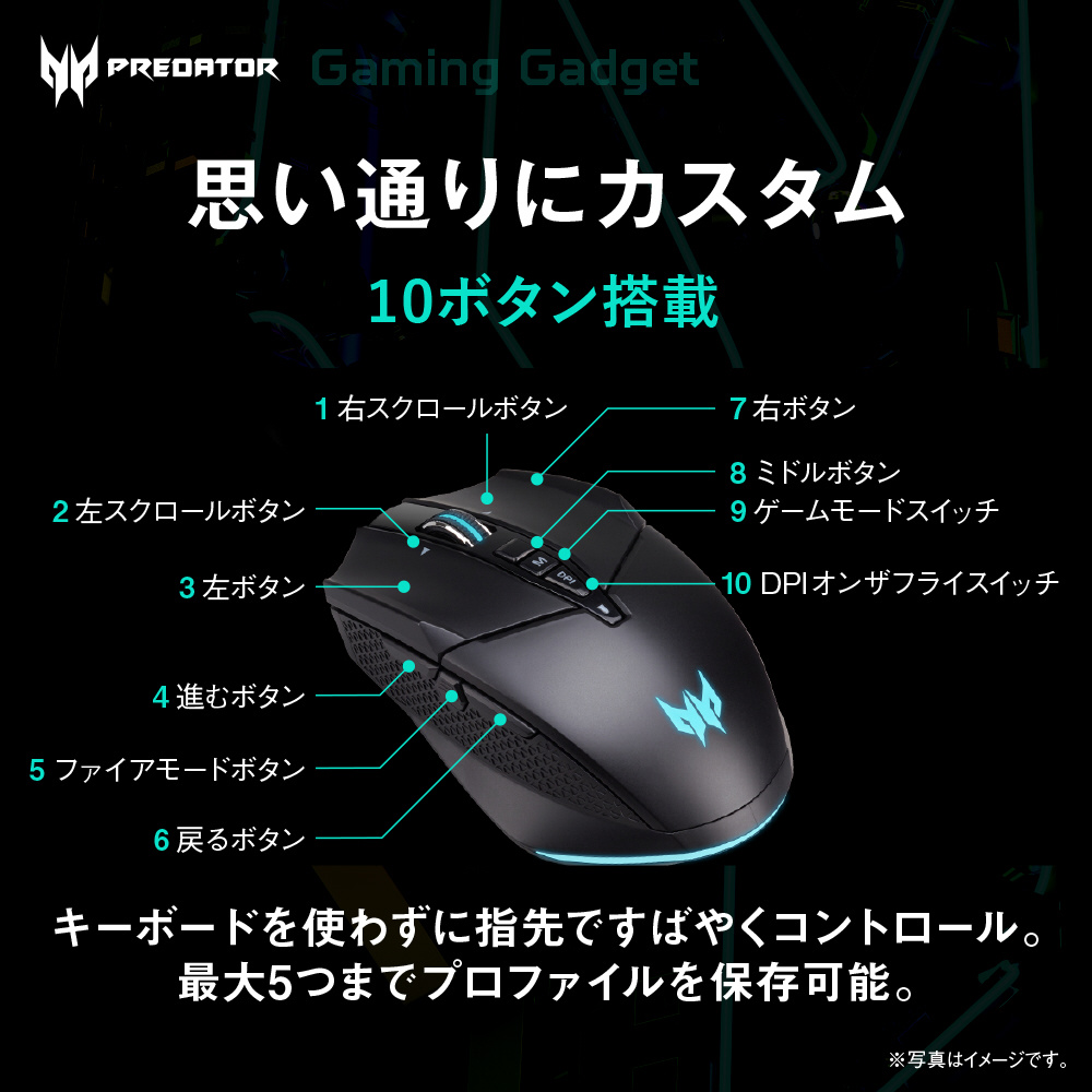 10ボタンには、思い通りのカスタマイズを。キーボードのホットキー、ショートカットキーを使うことなく、指先ですばやくコントロール。最大5つまでプロファイルを保存可能。