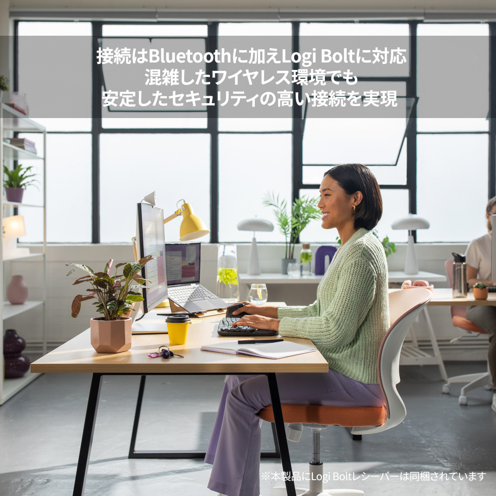 接続はBluetoothに加えLogicool独自のLogi Boltに新たに対応。「Logi Bolt」は連邦情報処理標準(FIPS)に準拠したグローバルスタンダードのセキュア接続専用モードに基づいた設計でよりクローズドな接続を実現しています。Logi Boltは6台までの対応デバイスに1つのUSBで接続可能なため、USBポートを有効活用できます。(接続距離:10m)
