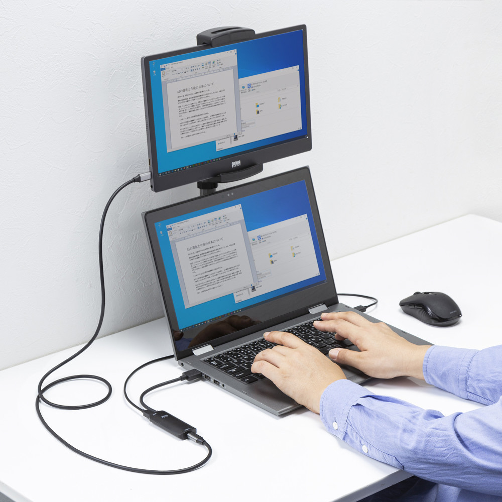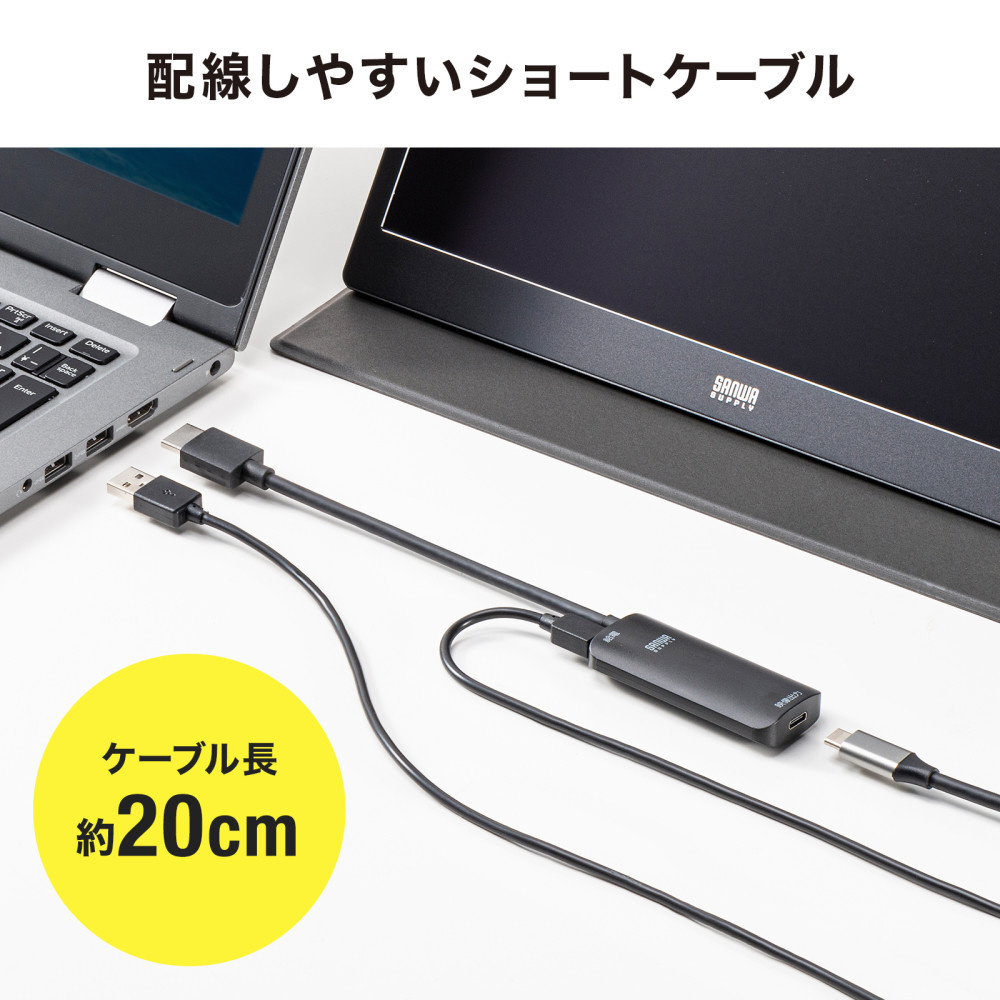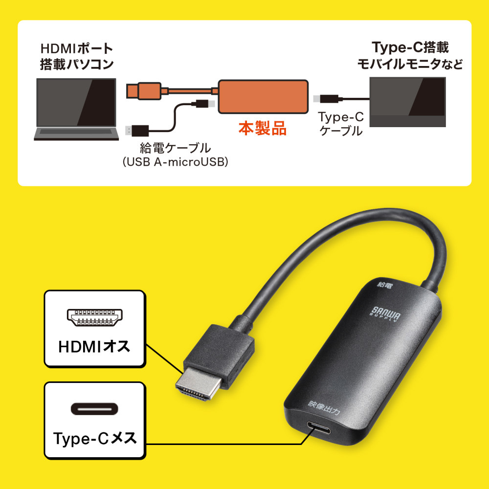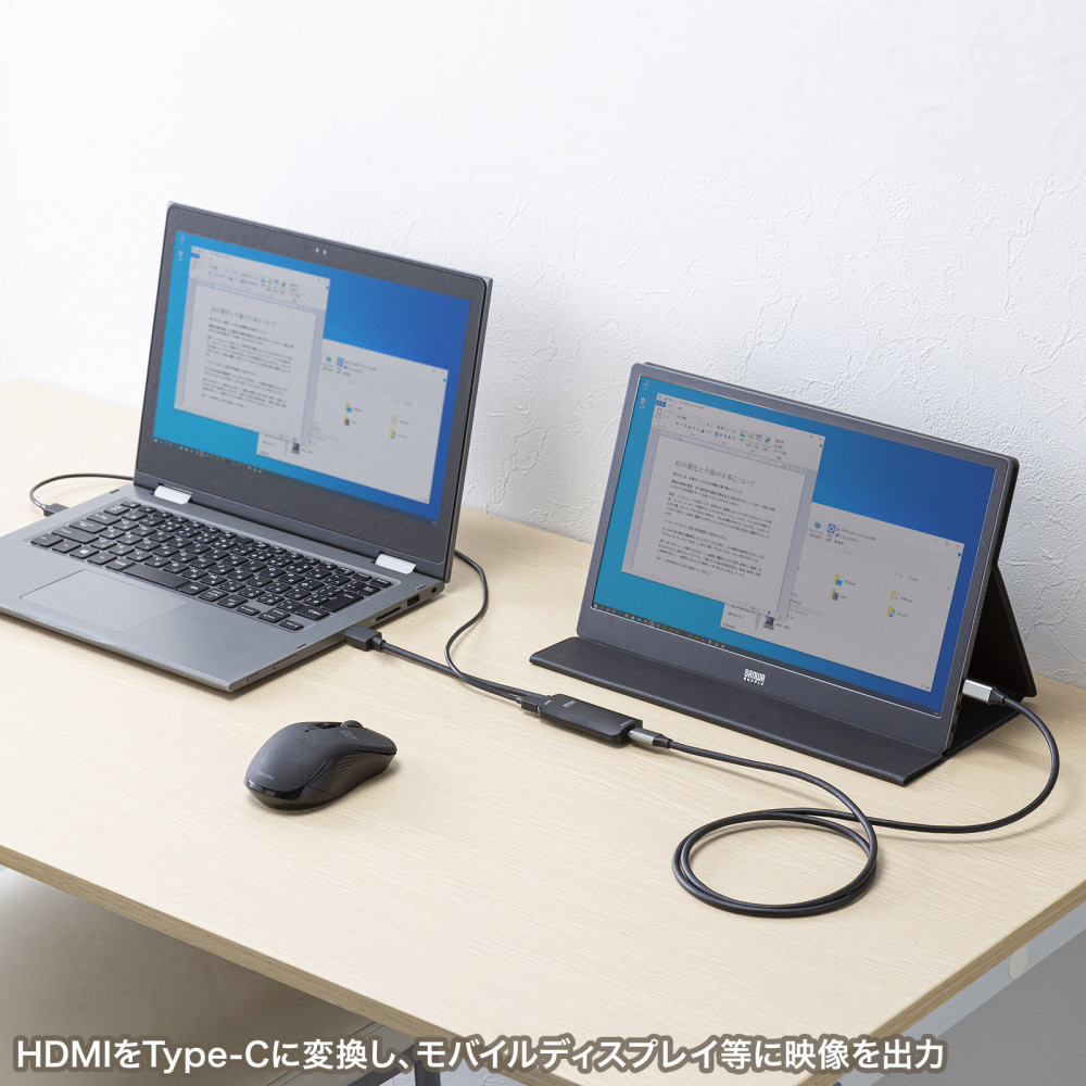 HDMI信号をUSB Type-C(DisplayPort Altモード)出力に変換し、Type-C入力ポートを持つモバイルディスプレイ等に出力することができるHDMI-USB Type-C変換アダプタ。
