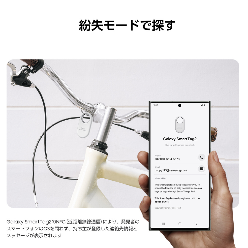 物やペットをを紛失した時、拾った人がスマートフォンでGalaxy SmartTag2をタップすると連絡先情報が表示されます。