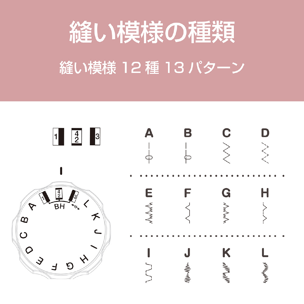 よく使う23種類25パターンの模様を厳選。縫い模様の選択は本体正面左のダイヤルを回して設定
