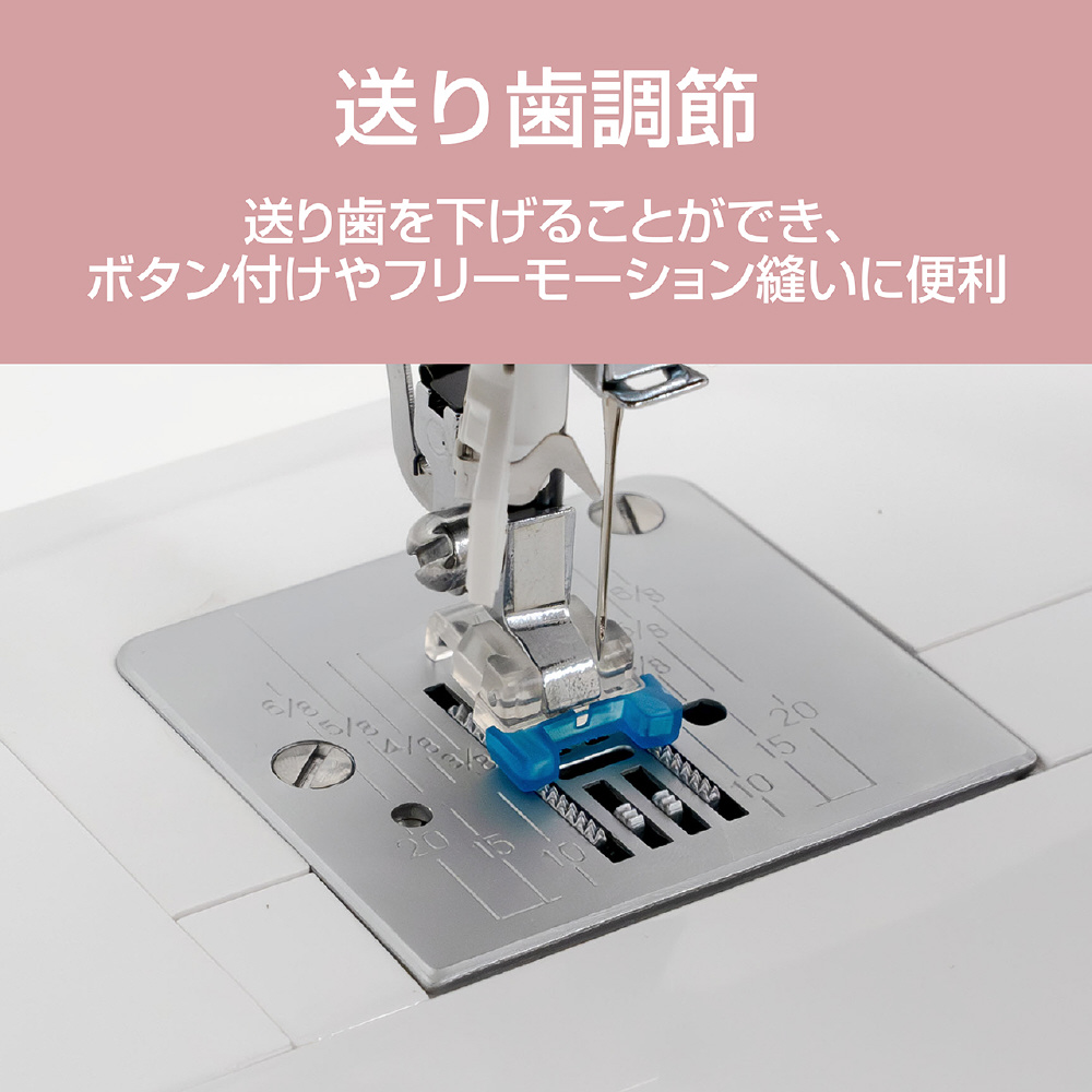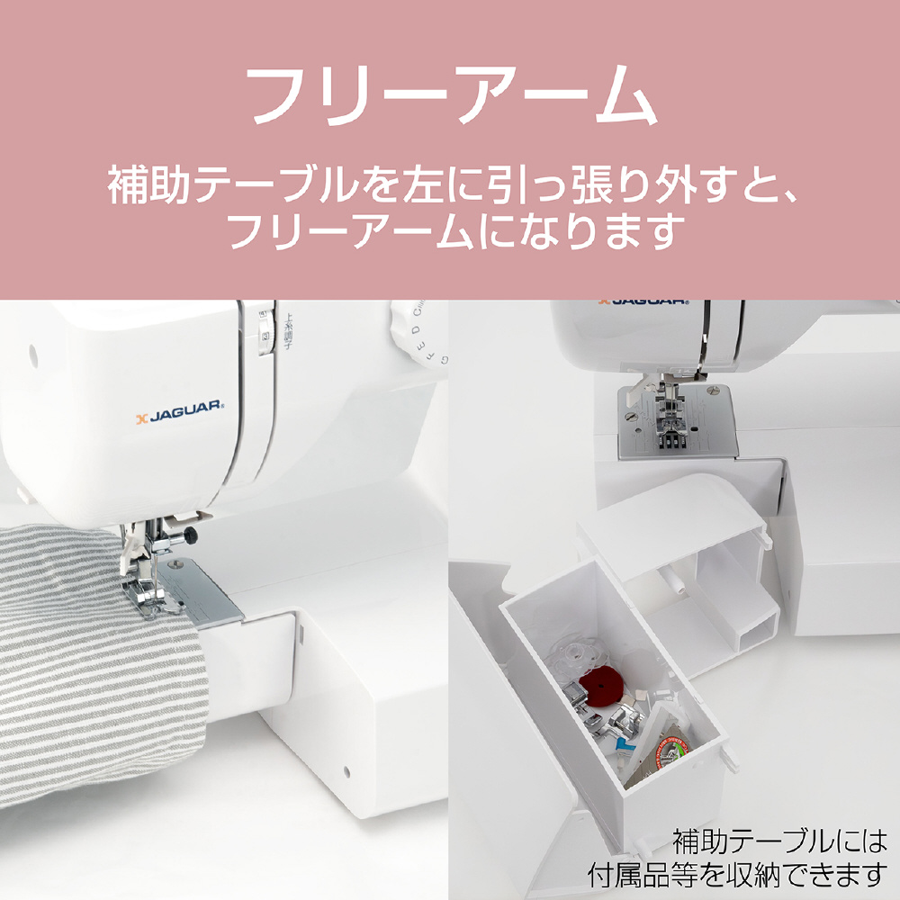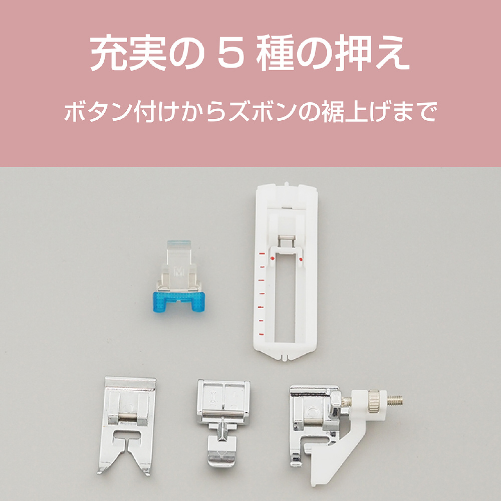 | 付属品 | フットコントローラー、ボタンホール押え、ボタン付け押え、ファスナー押さえ、隠し縫い押え、ボビン(本体1個、付属3個)、針(3本)、シームリッパー、糸コマクッション、多用式針板ドライバー、ミシンカバー |