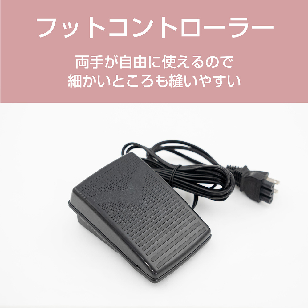 フットコントローラーで操作。スタート・ストップ・スピード調節を足元で操作。両手で生地を持つ事ができ安心・確実