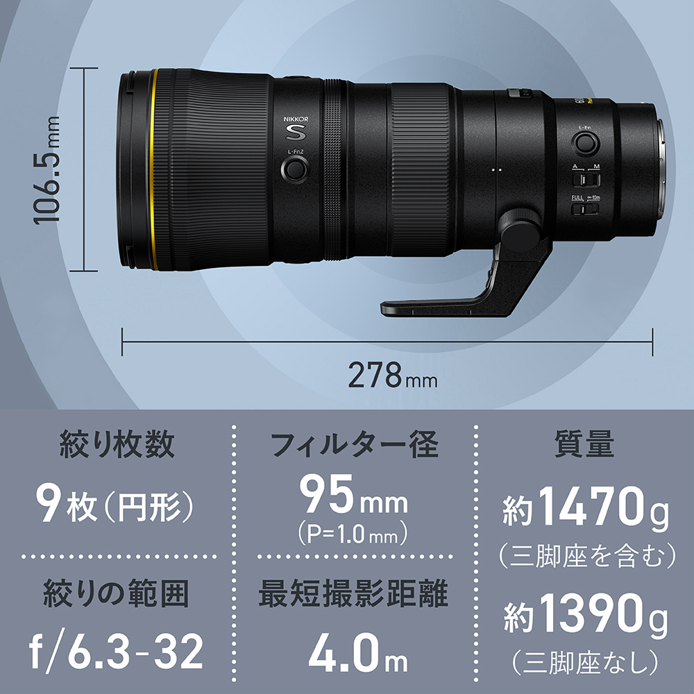 | 最大径×全長 | 約106.5mm×278mm(最大径×レンズマウント基準面からレンズ先端まで) |
