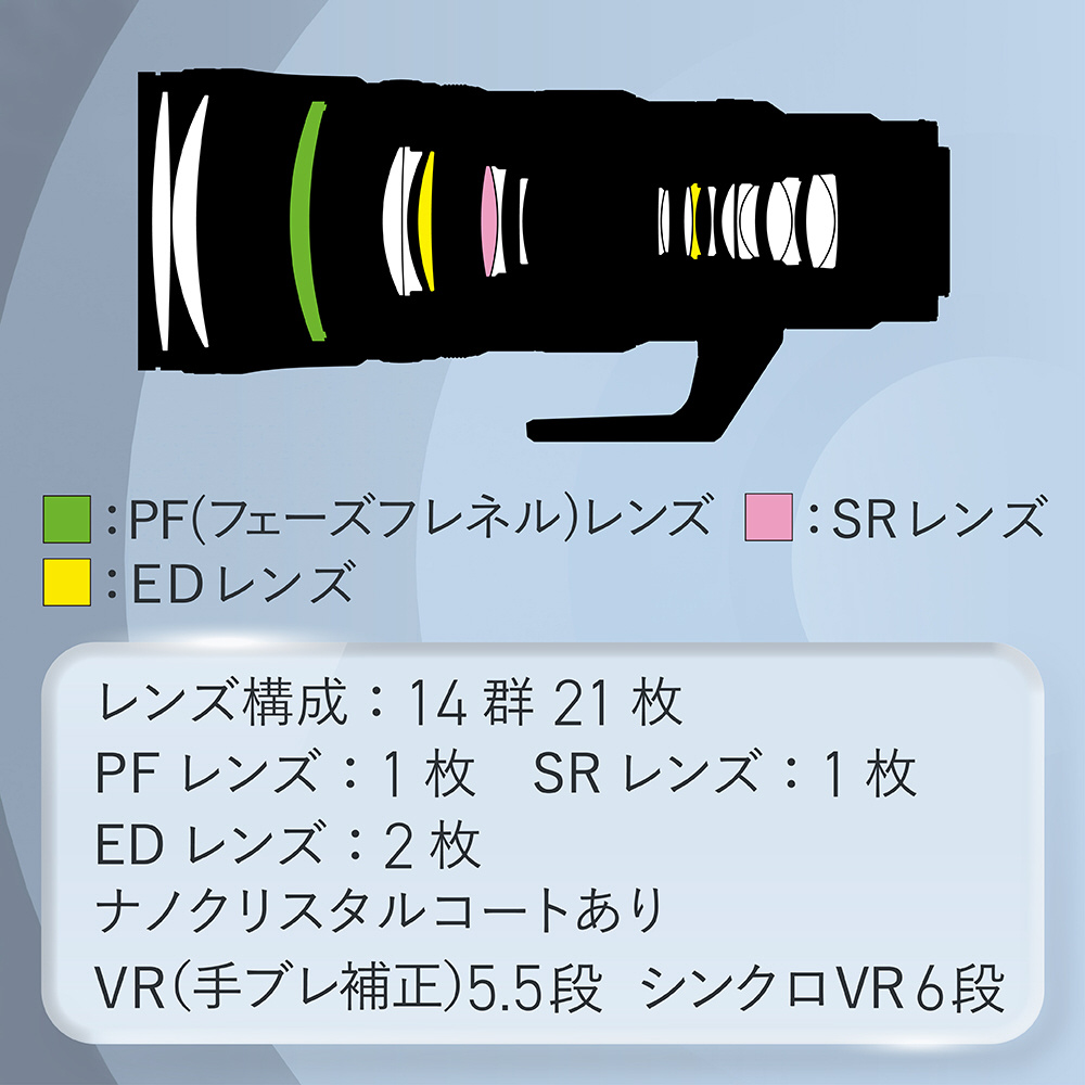 | レンズ構成 | 14群21枚(EDレンズ2枚、SRレンズ1枚、PFレンズ1枚、ナノクリスタルコートあり、最前面のレンズ面にフッ素コートあり) |