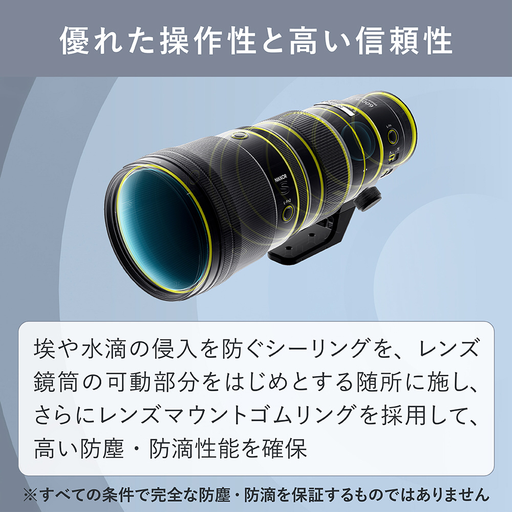 高い防塵・防滴性能を持ち、レンズ前面に防汚効果のあるフッ素コートを採用