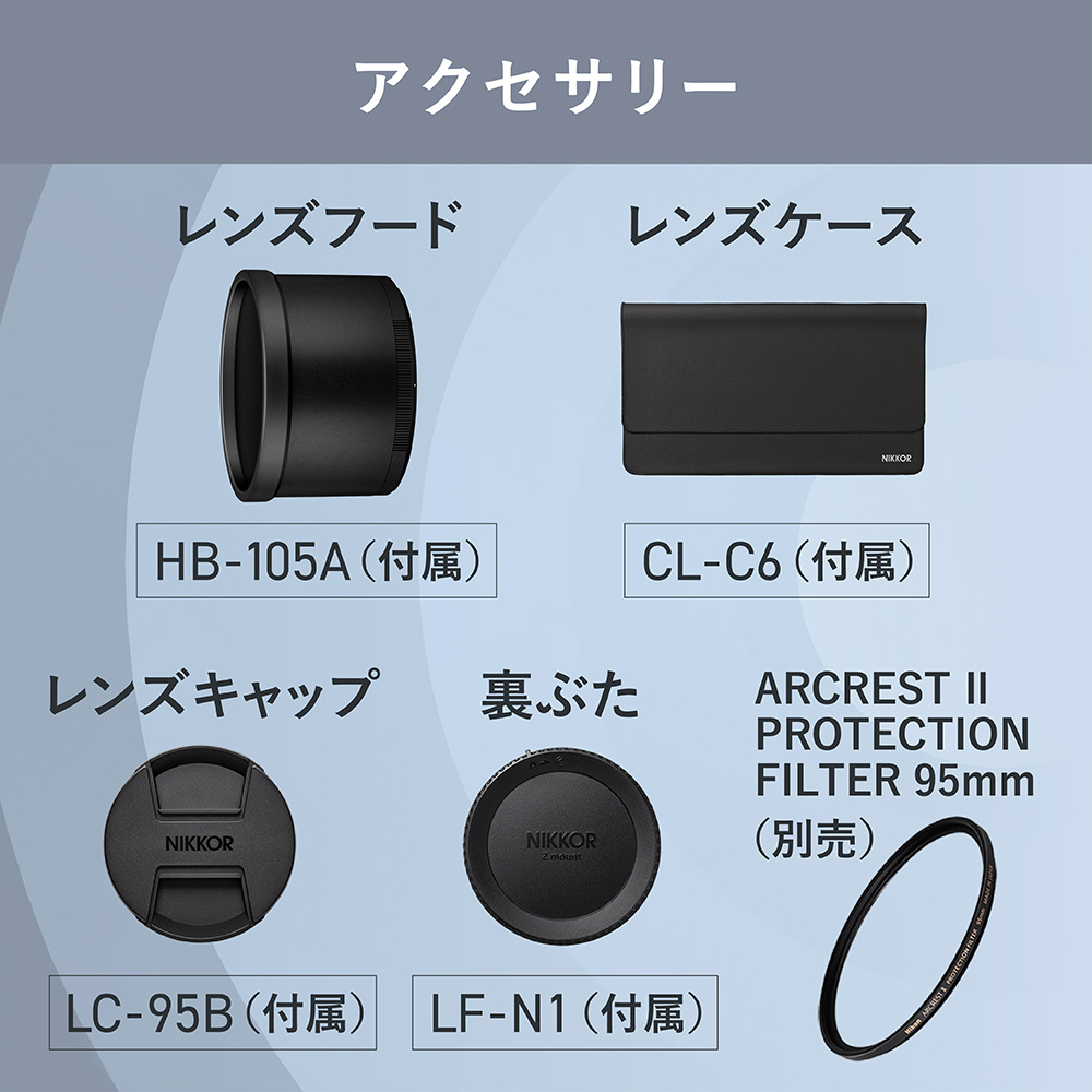 | 付属品 | レンズキャップ95mm LC-95B(スプリング式)、レンズキャップ(裏ぶた) LF-N1、レンズフード HB-105A、レンズケース CL-C6 |