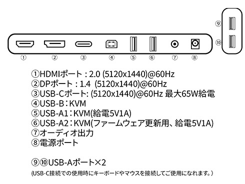 ※USB-Bケーブルは付属していないため、 HDMIとDPでKVMを利用する場合は別途ご用意ください。