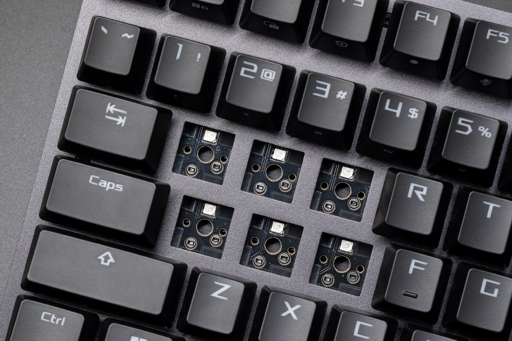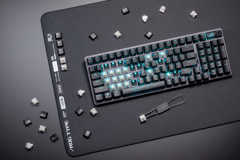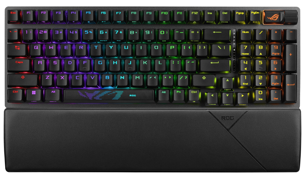 ROG Strix Scope II 96 Wireless ゲーミングキーボードは、トライモード接続、ストリーミング用ホットキー、多機能コントロール、ホットスワップ対応潤滑剤塗布済みROG NX Snow & Stormメカニカルスイッチ、ROGキーボードスタビライザ、PBTダブルショットキーキャップと消音シリコンフォーム、3段階の角度調整、リストレストを装備