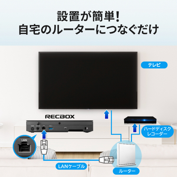 RECBOXの設置は、テレビなどがつながっている自宅のルーターと接続するだけ。すぐに使い始めることができます。