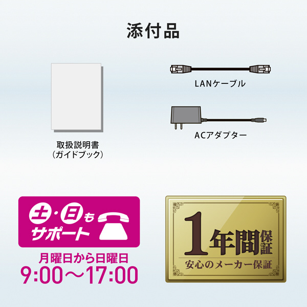| 付属品 | LANケーブル、ACアダプター、取扱説明書(ガイドブック) |