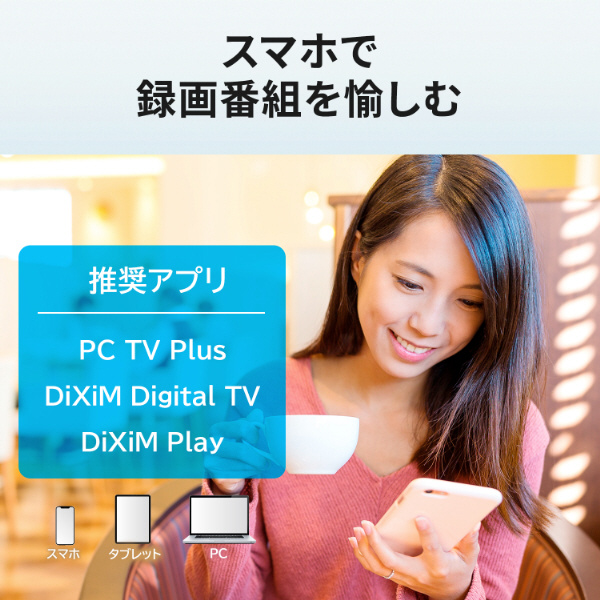 タブレット、スマホ、ノートPCなどで外出先でも録画番組を視ることができます。(別途アプリの購入、インストールが必要になります。)視聴環境の通信速度に合わせてリアルタイムで映像を変換するためスムーズで快適な視聴ができます。