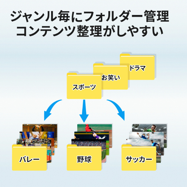 RECBOXの設定画面よりフォルダーを作成し、お気に入りのコンテンツをフォルダーごとに整理することができます。番組をカテゴリー別に整理しておくと、録画番組の検索がより早く、簡単にできます。