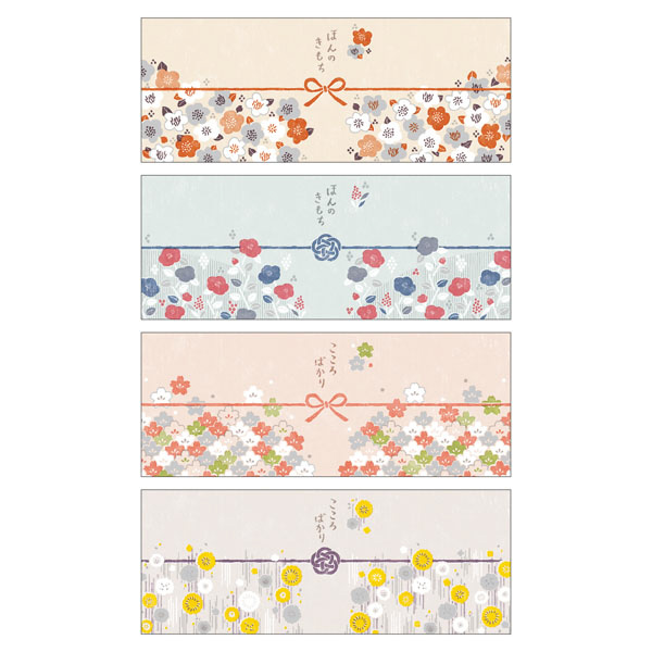 | 仕様1 | ■サイズ:H82×W210mm■材質:伊予和紙(70g/m2)■入り数:1冊20枚(4柄各5枚)■留めシール(和紙):40片付き |
