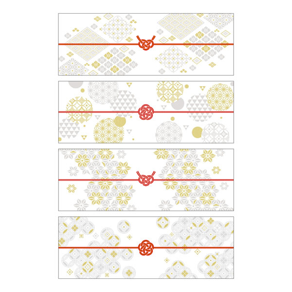結切と梅結びの水引と、縁起の良い伝統紋様が描かれた上品なデザインで、出産などの内祝や、挨拶用のギフト、手土産などの贈りものにおすすめ。