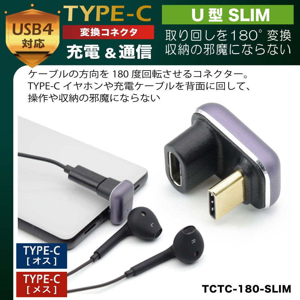 USB Type-C変換コネクタのU型SLIMタイプ。取り回しを180°変換させます。