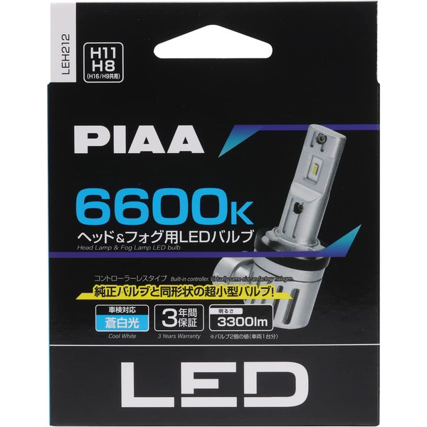 LEH212 ヘッドライト/フォグランプ用LEDバルブ コントローラーレスタイプ 6600K 12V19W 3300lm H8/H9/H11/H16 車検対応 2個入り LEH212