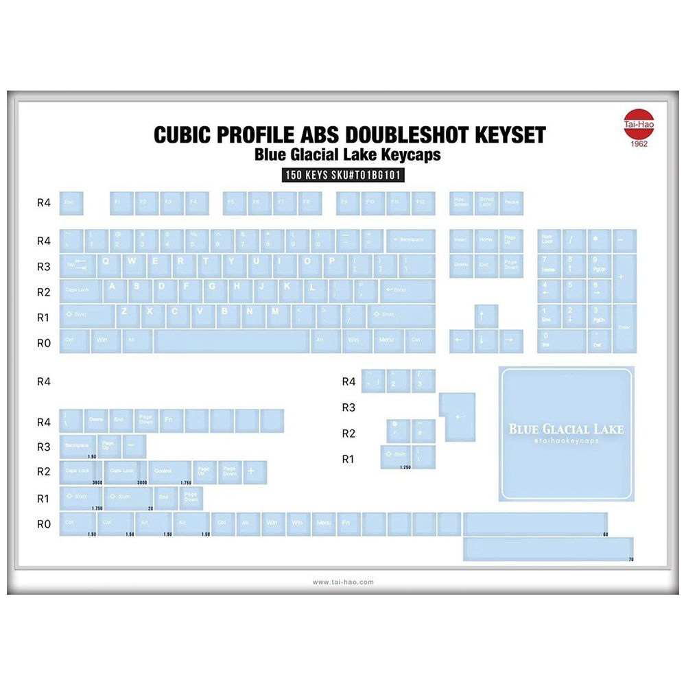 淡いブルーのベースに、白い文字が可愛らしい、シンプルなTai-HaoBlue Glacial Lake ABS Double shot Keycap Set。