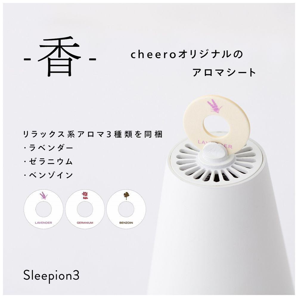 cheeroが開発したアロマシート計14種類から、スリーピオン3には眠りに適したリラックス系アロマから3種類(ラベンダー・ゼラニウム・ベンゾイン)を同梱しています。