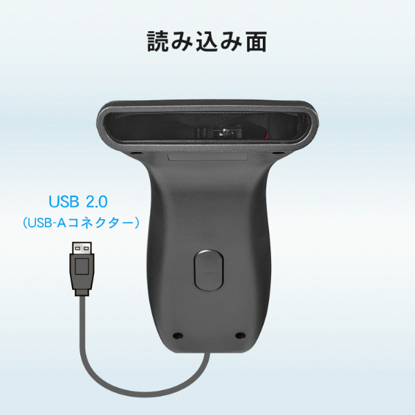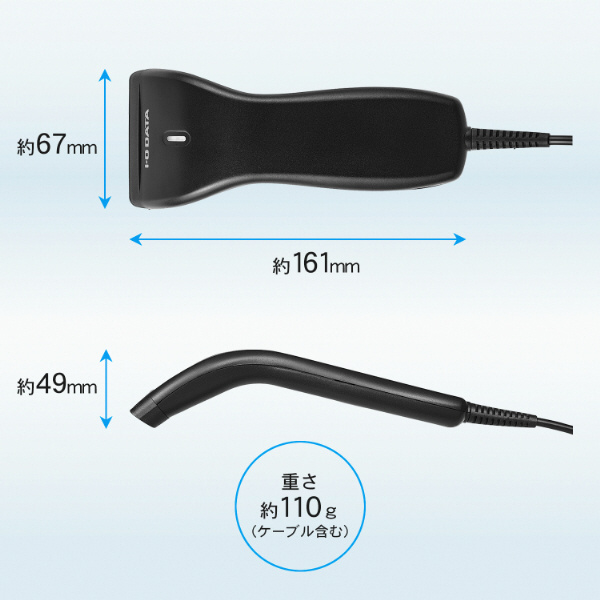 | 仕様3 | [電源]USBバスパワー [質量(本体のみ)]約110g(ケーブル含む) [外形寸法(本体のみ)]約67(W)×49(D)×161(H)mm(ケーブル部及び突起部を含まず) [添付品]取扱説明書 [使用温度/湿度範囲]0〜40°C/20〜80%(結露なきこと) [各種取得規格]RoHS指令準拠(10物質)、VCCI Class B ※1 バーコードの品質、読み取り環境によって変動します。 |