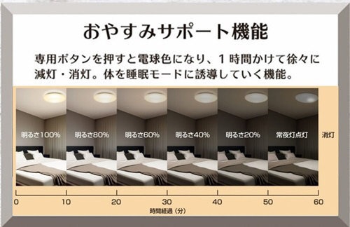 1時間かけて徐々に明るさを減灯・消灯し睡眠モードに誘導します