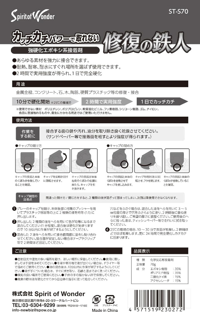 | 商品名 | 金属接着剤 修復の鉄人 ST-S70 強硬化エポキシ系接着剤 70g |