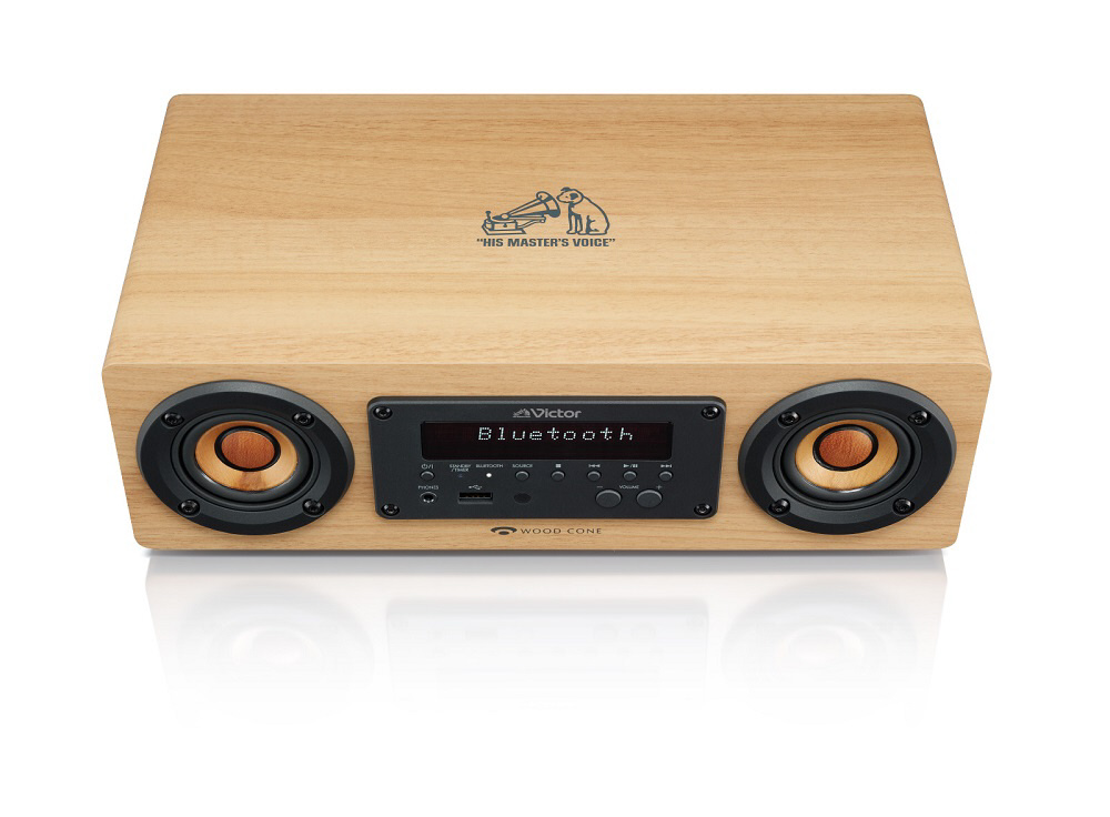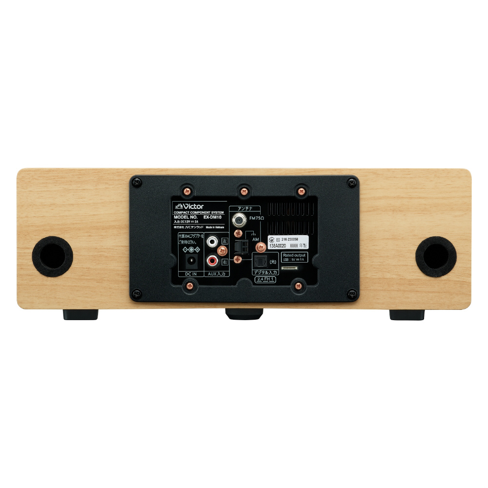 木目調のフラット&ローデザイン、および Victor ブランドを象徴する「犬のマーク」の天板へのプリント、さまざまなインテリアや部屋によりなじみやすいよう、ナチュラルウッドをベースカラーとした明るいカラーリングのデザインを採用。