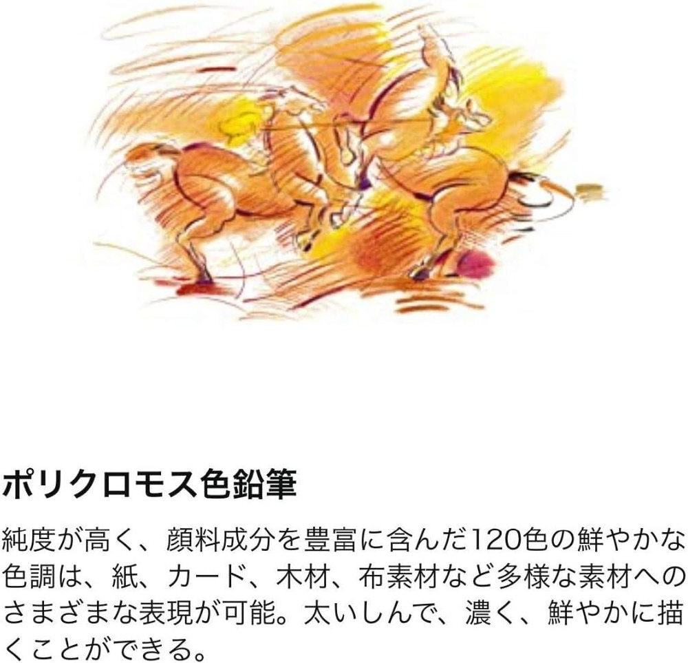 純度が高く、顔料成分を豊富に含んだ120色の鮮やかな色調は、紙、カード、木材、布素材など多様な素材へのさまざまな表現が可能。太い芯で、濃く、鮮やかに描く事が出来ます。