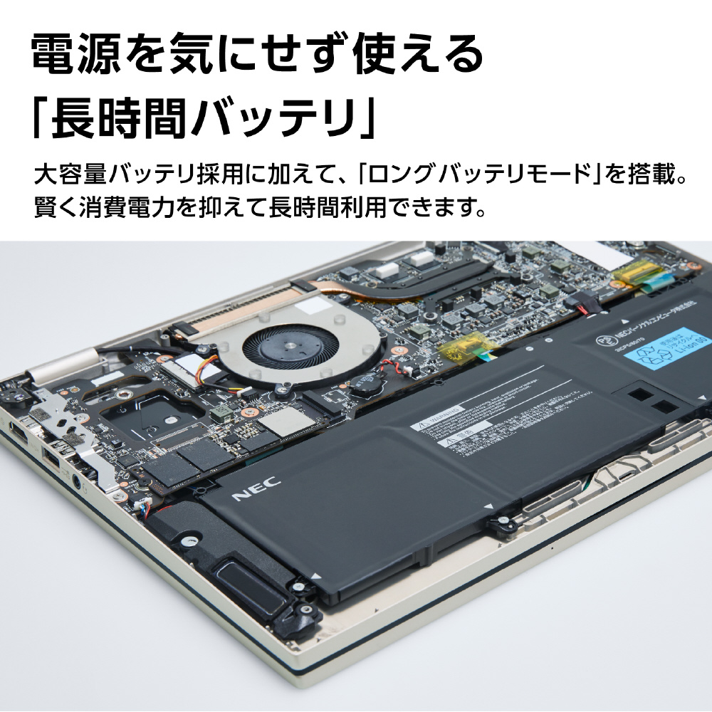 大容量バッテリーを搭載。さらに、「ロングバッテリーモード」により かしこく消費電力を抑えて長時間使用できます。